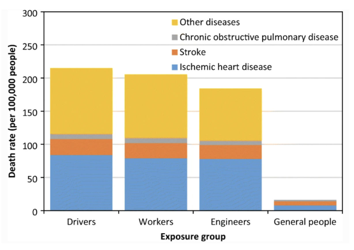 Some occupational groups, like operators of heavy machinery in mining, cement industry, contruction etc are exposed to very high levels of air pollution that can have a great impact on their health. The graph here shows the estimated health impacts of the subway construction project through the PM air pollution by occupational groups and general people (Saeedi, et al., 2021). And as you can see, the health impact are the greatest on drivers of the machines used.